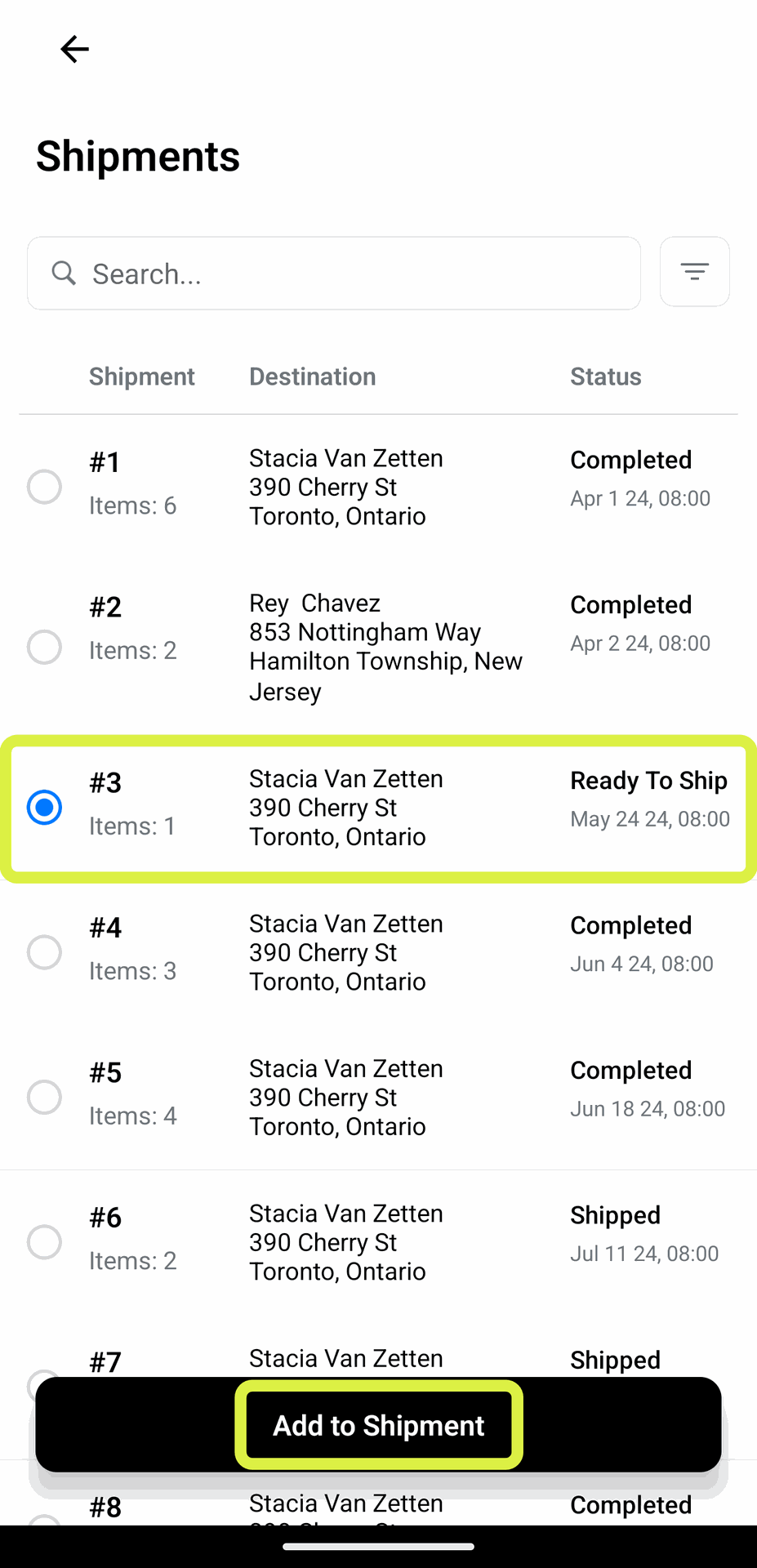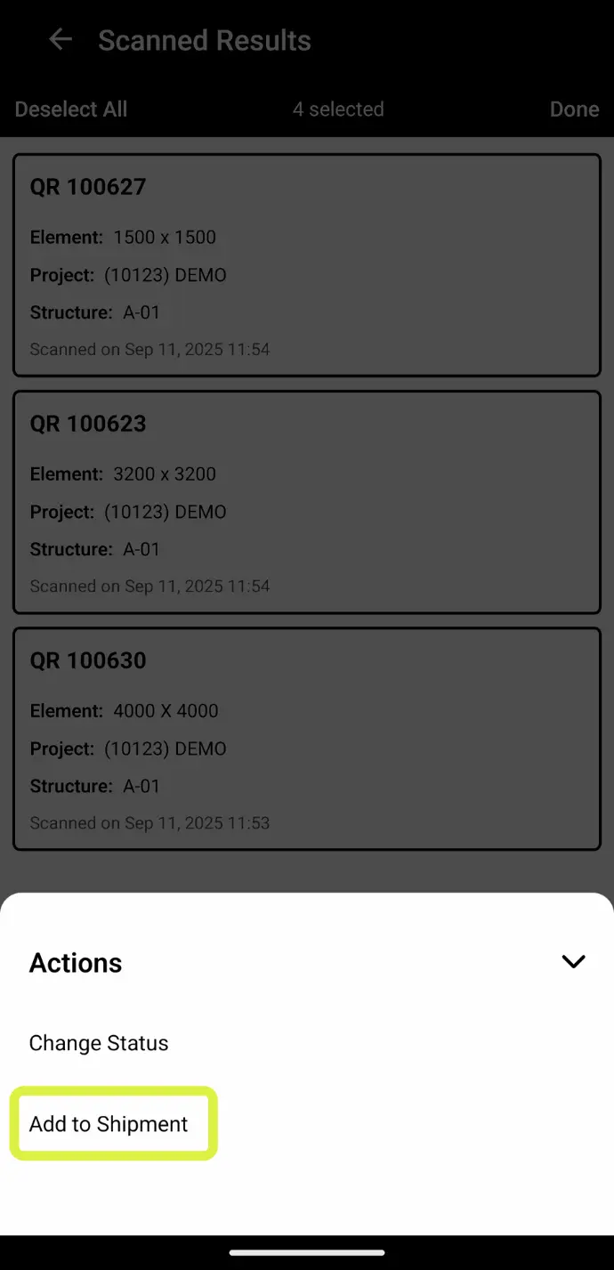 Select the Shipment you want to add the Elements to, then click 'Add to Shipment'