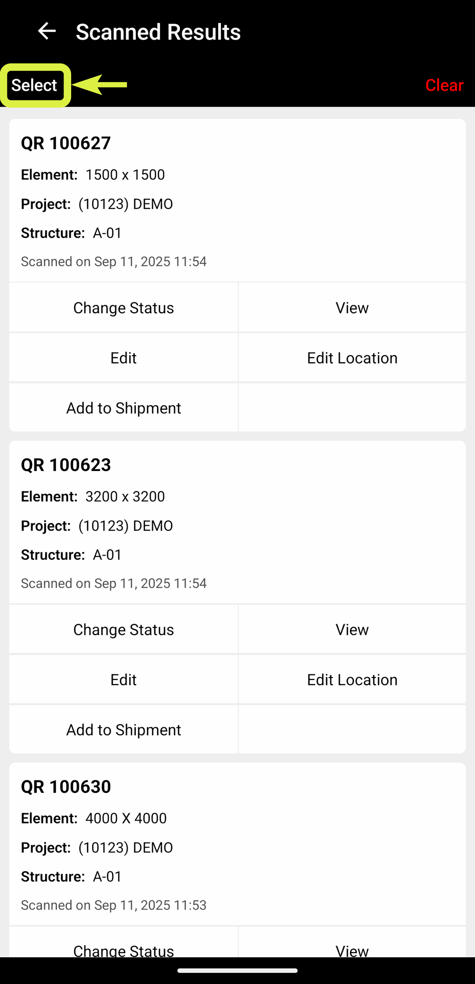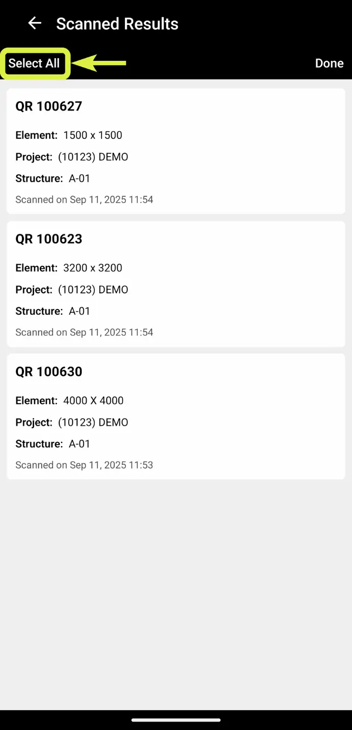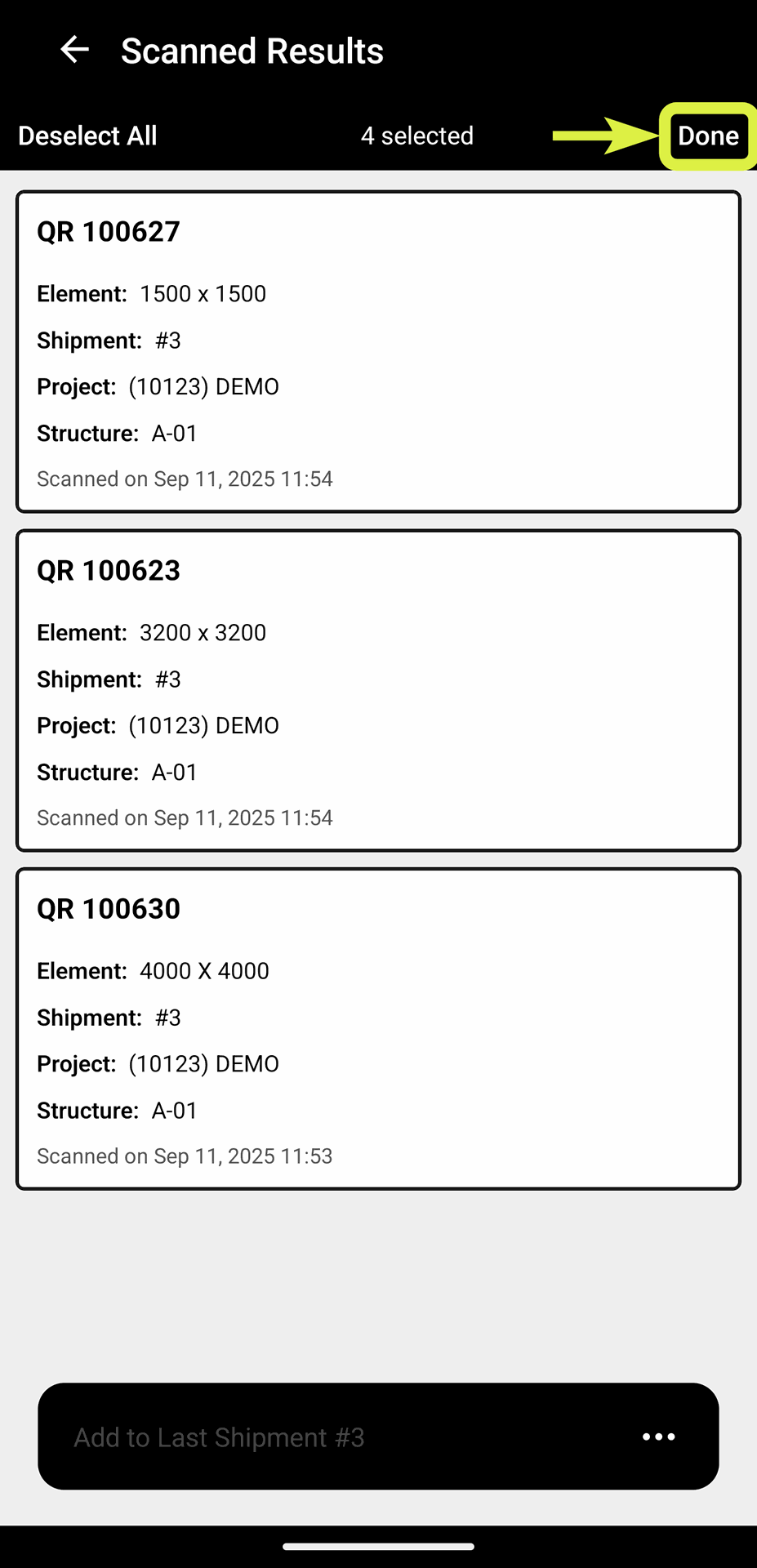 If you're done with all the scanned Elements, click on 'Done', then 'Clear' and repeat the process for any other shipments
