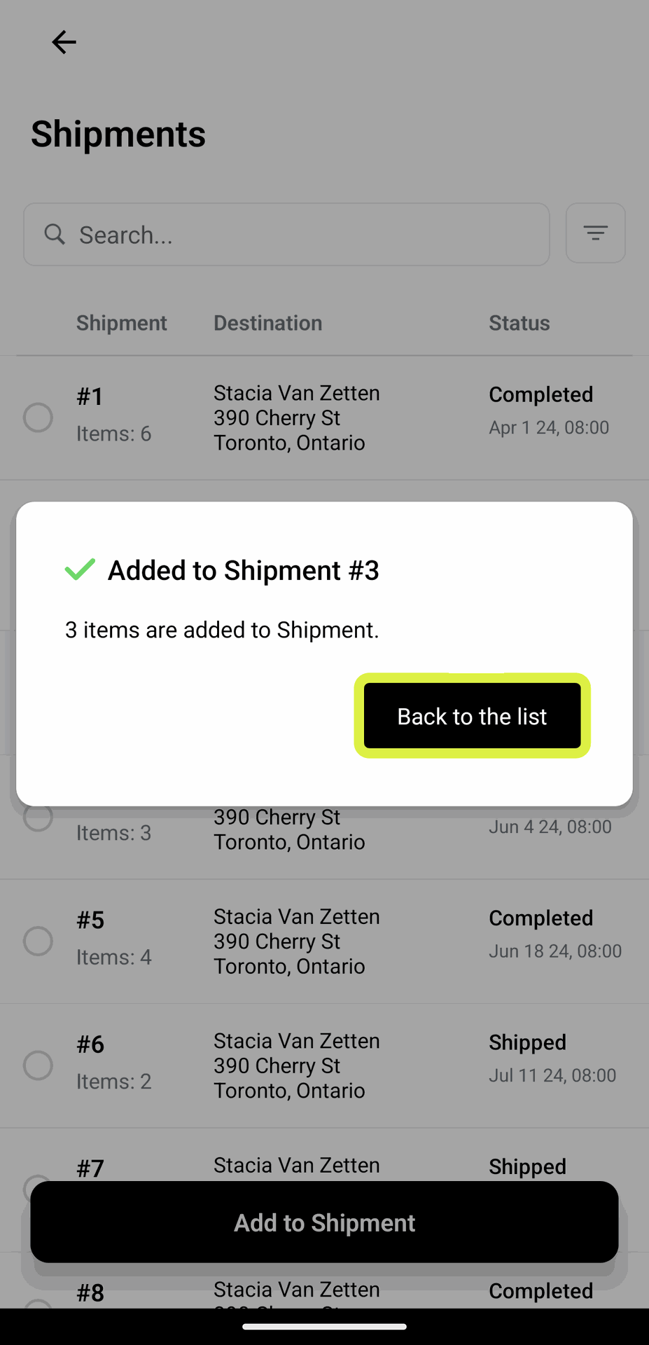 One the shipments are added, click on 'Back to the List' to go back to the list of scanned Elements
